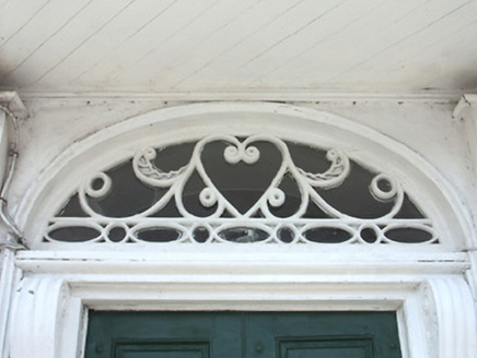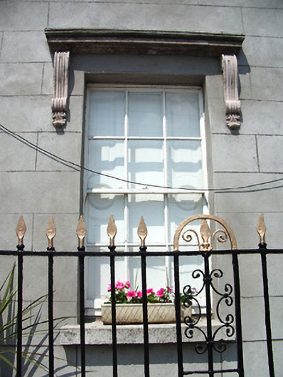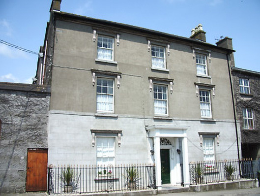 End-of-terrace double-pile three-bay three-storey house, built c. 1800, with carriage arch to side. Pitched slate roofs, with rendered chimneystacks having square profile pots, cast-iron rainwater goods and moulded eaves course. Painted rendered walls, ruled-and-lined, re-rendered to ground floor. Square-headed window openings with carved limestone cornices, scrolled brackets and stone sills. Timber sliding sash six-over-six pane windows. Timber panelled shutters to interior. Porch to entrance comprising timber canopy with moulded cornice and fluted square profile columns and pilasters, with limestone step. Moulded segmental-headed door opening with render and timber doorcase having decorative scrolled brackets. Timber panelled door with ornate fanlight with central winged heart motif. Coursed snecked limestone wall to side, with pitched slate coping, three-centered archway having dressed limestone voussoirs, and replacement timber battened double-leaf doors. Square-headed pedestrian entrance opening with timber battened door. Decorative wrought-iron railings to front of house on low rendered plinth.