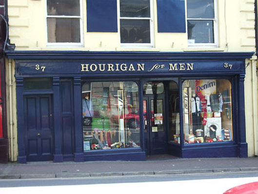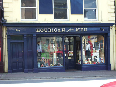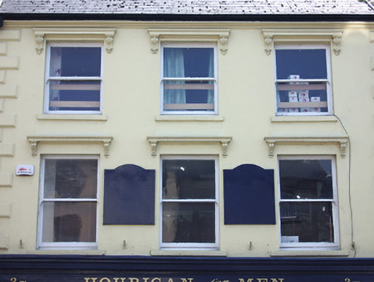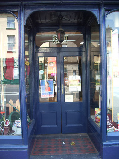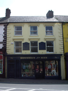 Terraced three-bay three-storey house, built c. 1840, with shopfront and separate access to upper floors. Pitched slate roof with rendered red brick chimneystack, cast-iron rainwater goods and moulded rendered eaves course. Painted rendered walls with render quoins. Square-headed window openings to upper floors, with moulded brackets and cornices, painted sills and timber sliding sash one-over-one pane windows. Timber shopfront to ground floor with moulded cornice and fluted pilasters with moulded brackets. Centrally-placed recessed entrance porch with timber boarding to ceiling and ceramic tiled pavement. Square-headed door opening with glazed timber panelled double-leaf door and overlight with angle decoration. Pseudo-three-centered arch arcading to timber display windows and porch. Square-headed door opening giving access to upper floors with timber panelled door and plain overlight.