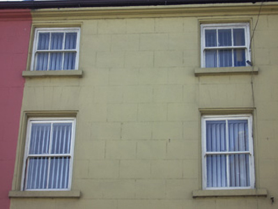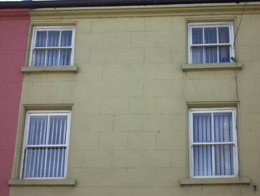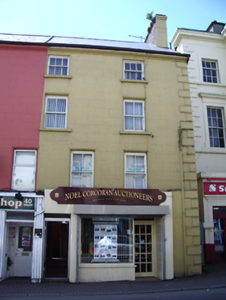 End-of-terrace three-bay four-storey house, built c. 1840, with shopfronts and separate access to upper floors at centre of façade. Pitched artificial slate roof with rendered chimneystacks, cast-iron rainwater goods and moulded eaves course. Painted rendered walls, ruled-and-lined, with render quoins. Square-headed window openings to upper floors with stone sills and recessed moulded surrounds. Timber sliding sash windows to western half, three-over-three pane windows to top floor, two-over-two pane to first and second floors and replacement uPVC to eastern half. Slightly-projecting twentieth-century painted rendered shopfronts to ground floor with square-headed display windows and having timber panelled double-leaf door with overlight to eastern shopfront and recessed opening with tiled pavement and glazed timber door to western shopfront.