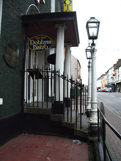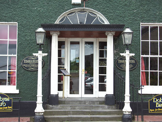 Terraced hotel, comprising four-bay three-storey house, built c. 1800, with recessed one-bay three-storey addition to west, and two-bay three-storey former house with late twentieth-century pubfront to east. Pitched roofs with felt covering to main block, slate to other blocks, rendered chimneystacks and eaves course and cast-iron rainwater goods. Painted roughcast rendered walls with painted render plinth to main block. Square-headed window openings throughout, with stone sills. Timber sliding sash six-over-six pane windows to lower floors of main block, replacement uPVC elsewhere. Round-headed entrance opening having timber canopy with moulded cornice and dentils and supported by fluted Ionic columns. Glazed timber double-leaf entrance door with sidelights and cobweb fanlight, accessed by limestone steps and flanked by wrought-iron railings and pair of cast-iron lamp bases c. 1860 with late twentieth-century heads. Low painted rendered boundary wall to façade with late twentieth-century tubular steel railings and tiled pavement.