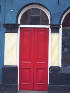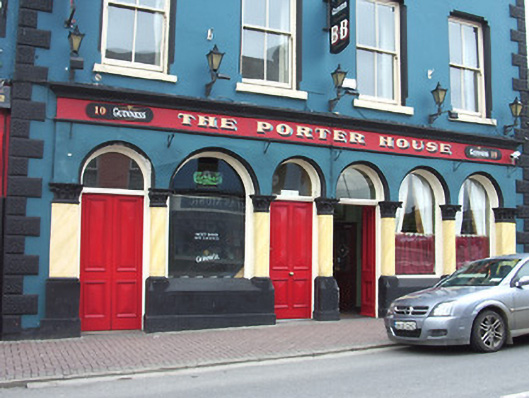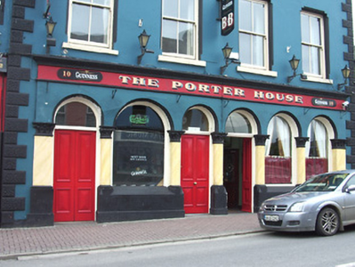 End-of-terrace four-bay three-storey house, built c. 1870, with arcaded pubfront to ground floor, three-storey return to rear, lean-to full-height extension c. 1950 to east elevation, and late twentieth-century extensions to rear. Pitched roof, covering not visible. Rendered chimneystacks and eaves course, with cast-iron rainwater goods. Painted rendered walls with render vermiculated quoins and painted rendered plinth. Square-headed window openings to upper floors with chamfered shouldered surrounds, stone sills and timber sliding sash two-over-two pane windows. Slightly projecting ground floor frontage with arcade of round-headed openings, separated by faux marble engaged columns and with pilasters to ends of frontage, all with Corinthian capitals and chamfered bases. Timber fasciaboard with moulded cornice and recent painted lettering. Fixed timber windows and timber panelled single and double-leaf entrance doors with plain fanlights.