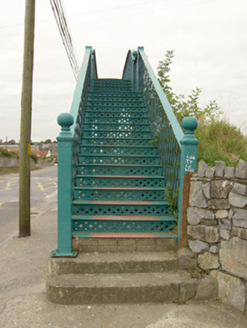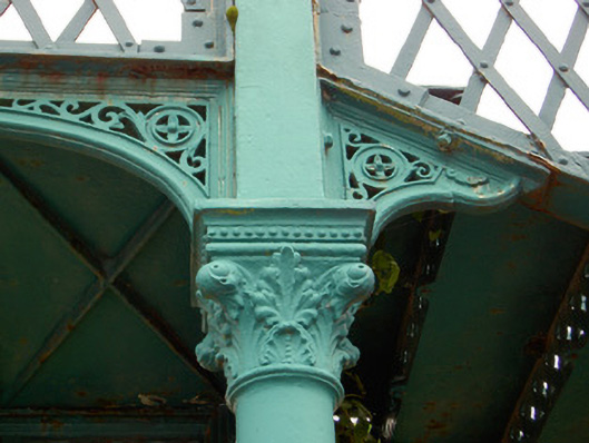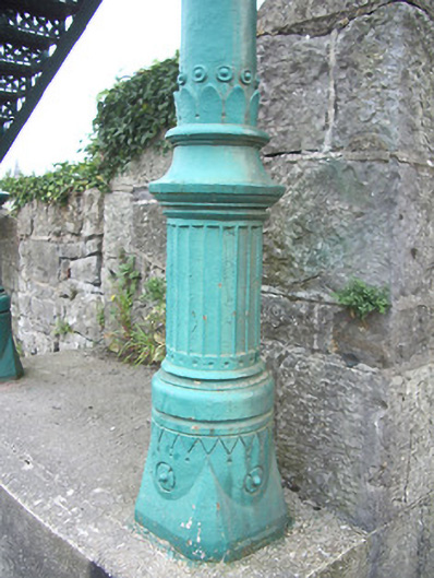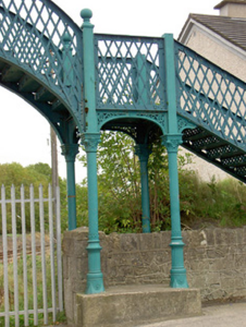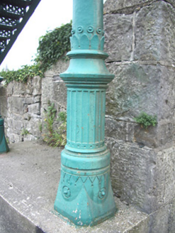 Freestanding single-arch painted wrought-iron footbridge, built 1848. Pseudo-three-centered arch structure with wrought-iron lattice decking, and wrought-iron lattice parapets. Accessed by flights of wrought-iron steps from each side having paired cast-iron piers with ball finials to flights of steps. Set of four decorative cast-iron Corinthian columns to junction of steps and bridge, with decorative bases on concrete plinths.