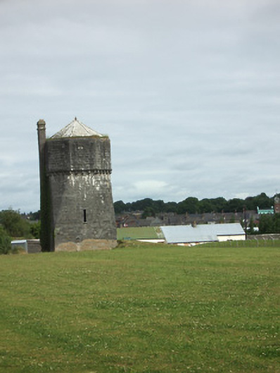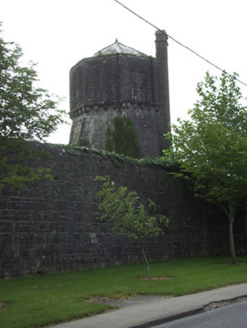 Detached octagonal-profile water tower on square-plan base, built c. 1880, to serve barracks. Conical roof, covering not distinguishable, with central spike finial. Coursed rock-faced limestone walls, having string course and corbels to octagonal upper walls, with battered base. Square-headed slit window with sill to south. Full-height coursed stone chimneystack to west face. Situated within walls of former barracks.