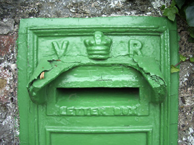 Wall-mounted cast-iron letter box, erected c. 1885, bearing crown and royal insignia of Victoria. Mounted in boundary wall of railway station.