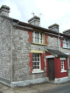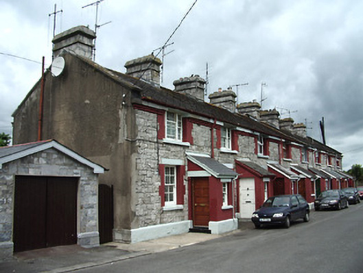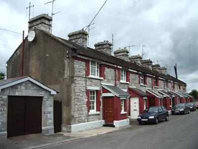 Two blocks of eight two-bay two-storey terraced houses, built c. 1900, with lean-to porches. Pitched artificial chisel slate roofs with coursed dressed limestone chimneystacks, and cast-iron rainwater goods. Lean-to slate roofs to porches. Snecked roughly-dressed walls with dressed limestone copings to end houses, dressed limestone and red brick courses to eaves, and stepped limestone plinths. Square-headed window openings with red brick block-and-start surrounds, painted dressed stone lintels to ground floor, and painted sills. Timber sliding sash windows survive to some houses, tripartite four-over-four pane to first floor, six-over-six pane to ground, two-over-two pane to porch. Replacement timber casement or uPVC in other houses. Timber battened entrance doors to some houses, replacement uPVC and glazed timber panelled elsewhere. Enclosed rear gardens, and rear access.