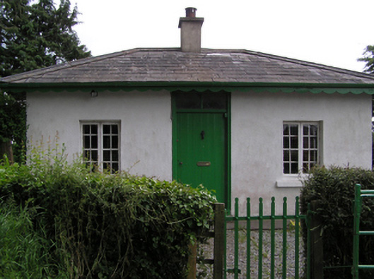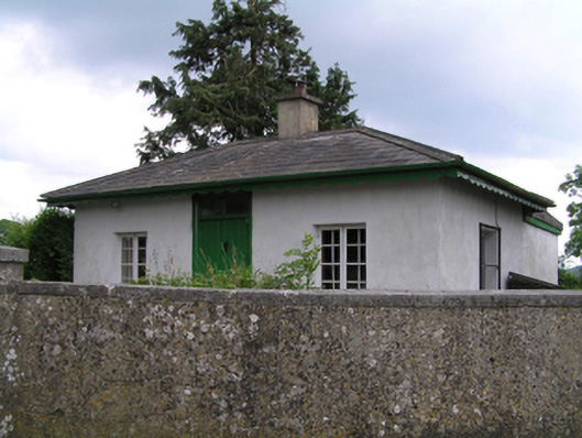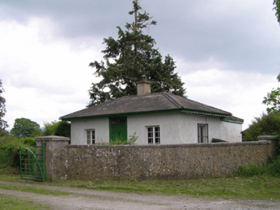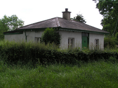 Detached three-bay single-storey gate lodge, built c.1900, with recent full-width flat-roofed extension to rear. Now disused. Hipped slate roof with rendered chimneystack, cast-iron rainwater goods and scalloped timber bargeboards. Painted rendered walls. Square-headed openings with timber casement windows having painted sills, and timber battened door with paned overlight. Set behind wall of entrance to former rectory. Cast-iron pedestrian gate to entrance.