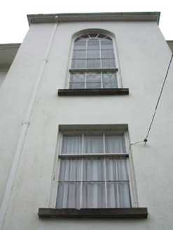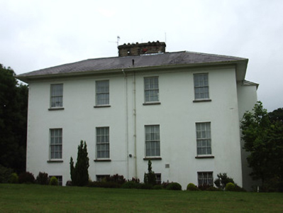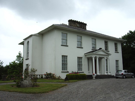 Detached five-bay two-storey over-basement house, built c. 1830, with four-bay rear elevation, portico to front elevation, and projecting bay with lean-to roof to middle of west elevation. Skirt artificial slate roof, with coursed cut-stone chimneystacks and cast-iron rainwater goods, with sheeted overhanging eaves and moulded eaves course. Painted rendered walls. Square-headed window openings with dressed stone sills and timber sliding sash six-over-six pane windows, three-over-six pane to basement with wrought-iron bars. West elevation has round-headed timber sliding sash nine-over-six pane window and three-over-six pane window. Painted rendered prostyle tetrastyle portico to main entrance with Ionic columns and pilasters, moulded pediment and cornices and stone flagged pavement accessed by flight of stone steps. Square-headed doorway with replacement timber panelled door having moulded render surround and decorative leaded overlight, flanked by two-over-two pane timber sliding sash sidelights. Dropped arch entrance opening to basement level at west elevation, with replacement glazed timber screen and door and spoked fanlight. Square-headed entrance opening to east elevation basement with replacement glazed timber double-leaf door. Situated in landscaped grounds.