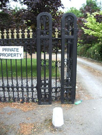 Quadrant entrance gates to Cahirabbey House, erected c. 1830. Comprises paired cast-iron inner piers supporting double-leaf vehicular and flanking single-leaf pedestrian gates, railings flank gates, terminated by painted carved capped stone piers with moulded cornices, roundels to friezes, having fan detail to caps and flared panels to shafts, with chamfered plinths. Curving cut-stone plinth walls terminated by similar piers, but without fan detail and panelling. Ornate cast-iron railings and similar gates. Sets of four hexagonal profile stone wheel guards to each side of entrance gates.