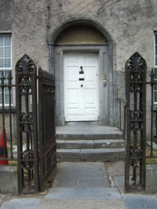 Semi-detached terraced house, built c. 1835, having four-bay three-storey front elevation and three-bay four-storey rear. Hipped slate roof with rendered chimneystacks and cast-iron rainwater goods. Roughcast rendered walls to front and mainly exposed random rubble sandstone to rear. Square-headed window openings to front elevation with dressed stone sills, having timber sliding sash three-over-six pane windows to second floor and replacement uPVC to lower floors. Timber sliding sash windows to rear, three-over-six pane to top floor and six-over-six pane to lower floors, middle bay having round-headed windows. Round-headed entrance opening to front with moulded limestone surround and chamfered cut limestone doorcase with panelled jambs and having timber panelled door with spoked fanlight and accessed by limestone steps. Chamfered cut limestone plinth wall to front with cast-iron railings, having lion's paw detail to bottom, decorative cast-iron gate piers and gate. Stone flagged pavement to area in front of house.