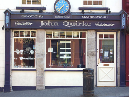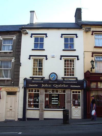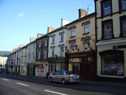 Terraced two-bay three-storey house, built c. 1840, with shopfront to ground floor. Pitched artificial slate roof with eaves course, rendered chimneystack and cast-iron rainwater goods. Painted rendered walls with plinth course. Square-headed window openings to upper floors with hood-mouldings, painted sills and timber sliding sash two over-two pane windows. Ground floor comprises chamfered cut sandstone piers, lower part of intervening spaces now filled in and square-headed twentieth-century fixed timber display windows and timber shopfront and replacement glazed timber door added.