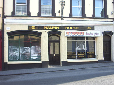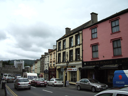 Terraced four-bay three-storey house, built c. 1870, formerly two two-bay buildings with similar shopfronts to ground floor. Pitched slate roof with moulded eaves course, rendered chimneystacks and cast-iron rainwater goods. Painted rendered walls, roughcast to ground floor, with moulded string courses to sill levels of upper floors, and plinth course. Square-headed window openings with moulded render surrounds, shouldered and with sill brackets and spandrel detail to second floor and kneed to first floor, all with dressed stone sills and replacement uPVC windows. Moulded cornice to shopfront, with late twentieth-century signboard. Recessed segmental-headed openings to ground floor with moulded heads, having fixed timber display windows with wrought-iron sill guards. Glazed timber panelled doors, double-leaf to shop entrance, having overlights and stone thresholds.