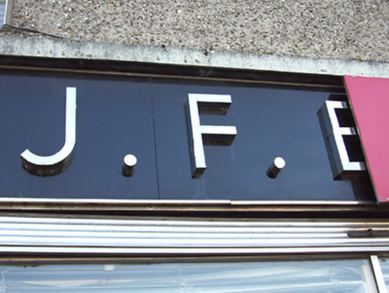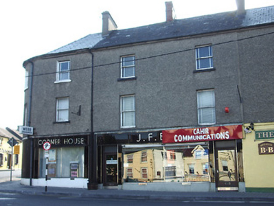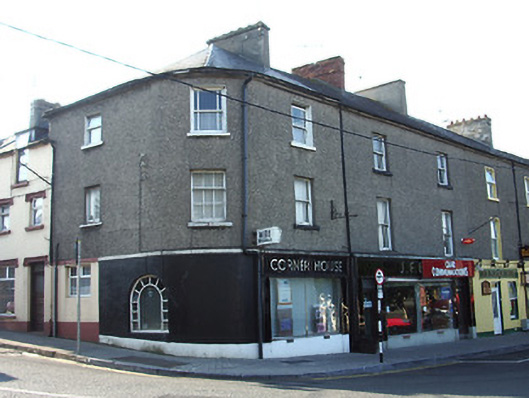 Corner-sited end-of-terrace three-storey house, built c. 1880, formerly two houses, with curved corner and having 1950s shopfronts to ground floor. Pitched slate roof, rounded to corner, with rendered and red brick chimneystacks, eaves course and cast-iron rainwater goods. Pebbledashed upper floors, rendered and painted to north elevation ground floor, with painted rendered plinth course, polished limestone to south end. Square-headed timber sliding sash windows with painted sills, mainly margined one-over-one pane and with one three-over-six pane to corner. Round-headed fixed timber window to ground floor of north elevation. Replacement windows to north elevation. Bakelite shopfronts with chrome trim to front elevation, with rendered cornice and chrome lettering to fascia. Square-headed fixed metal display windows and glazed and timber entrance doors with overlights and metal trim.