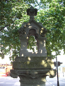 Freestanding carved sandstone fountain, dated 1876. Composed of an open Gothic style tabernacle or baldachino with foliate finial, trefoil-headed openings flanked by square-profile columns with impost course and gables to sides terminated by lions' heads to each corner, on stepped sandstone base inscribed 'In memoriam' and 'AD 1876', atop round column with foliate capital, moulded shaft ring having lions' head spouts and moulded base, the whole set on stepped purple plinth with memorial inscription. Positioned in an octagonal dressed limestone water-filled basin set in paved area at centre of The Square.