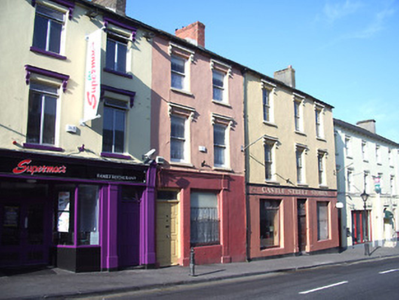 Terraced two-bay three-storey house, built c. 1860, with former shopfront to ground floor. Pitched slate roof, red brick chimneystacks, eaves course and cast-iron rainwater goods. Painted rendered walls. Square-headed window openings to upper floors, with cornices having scrolled brackets, painted sills, and timber sliding sash one-over-one pane windows. Timber and render shopfront to ground floor, with moulded cornice and ruled-and-lined pilasters with plinth blocks. Recessed flat-headed former display window with rounded corners to fixed timber frame, having painted sill and recent wrought-iron sill guard. Square-headed door opening with chamfered jambs and timber panelled entrance door with overlight.