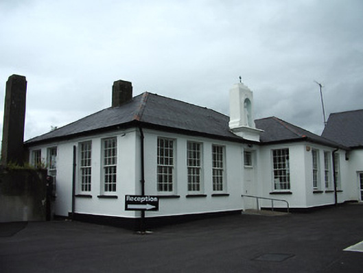 Detached L-plan, seven-bay single-storey former school, built c. 1900, with four-bay end walls. Now in use as day care centre. Hipped slate roof, re-roofed to west and south, with plinth course, coursed stone and rendered chimneystacks, and cast-iron rainwater goods. Large niche over entrance with stepped top with metal cross finial, moulded base and having round-headed niche with statue. Rendered walls with plinth, painted to south and west. Square-headed window openings with concrete sills, painted to south and west, and timber sliding sash twelve-over-twelve pane windows. Twelve-over-eight pane windows to rear elevation. Square-headed entrance doorway, with fluted surround, timber panelled double-leaf door, and margined overlight.