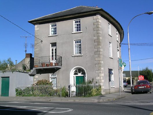 Corner-sited end of terrace two-bay three-storey house, built c.1840. Hipped slate roof with overhanging eaves and rendered chimneystack. Rendered walls with raised chanelled ashlar sandstone quoins. Square-headed replacement uPVC windows with painted sills, and having metal window guards to east elevation ground floor. One first floor window converted to French doors, with steel and concrete balcony. Round-headed doorway to south elevation, having moulded render surround and timber panelled door with narrow side-lights and decorative fanlight. Shallow garden to front elevation bounded by cast-iron railings. Yard to rear bounded by ruled-and-lined rendered wall.