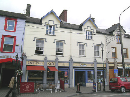 Terraced five-bay three-storey house and public house, built c.1840, formerly two buildings, two-bay to south and three-bay to north, and having integral carriage arch to northmost bay. Pitched slate roof with dormerrendered eaves course, cast-iron rainwater goods and rendered chimneystacks. Rendered walls. Square-headed uPVC replacement windows with chamfered surrounds, label-mouldings and painted sills. Ground floor openings separated by painted cut limestone pilasters with trefoil heads and gabled copings to chamfered panels. Timber fascia with moulded timber cornice and render stall risers to mainly square-headed plate-glass display windows, with cast-iron window guards. Timber panelled doors. Centre display window composed formerly of three segmental-arched lights, mullions now gone, with decorative detailing to spandrels. Tudor-arch painted limestone carriage arch with cut limestone wheelguards and replacement timber battened double-leaf doors.