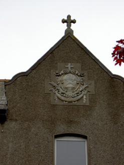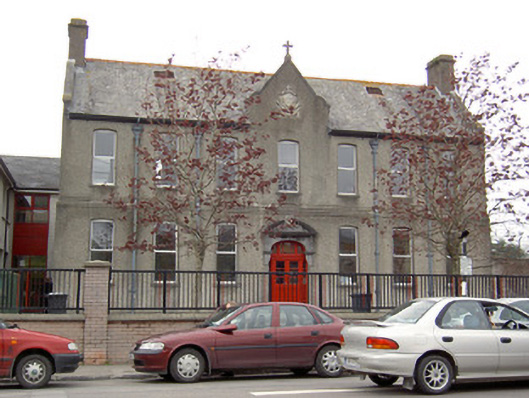 Detached seven-bay two-storey school, dated 1899, with gable-fronted central entrance bay, and having single-bay two-storey and four-bay two-storey flat-roofed extensions to rear. Pitched slate roof with rendered chimneystacks, roof vents, cast-iron rainwater goods and stone cross to gable-front. Roughcast rendered walls with render platband and limestone Christian Brothers plaque to gable-front. Red brick walls to rear and return. Segmental-headed openings with limestone sills and square-headed replacement uPVC windows. Elliptical-arched entrance opening with cut limestone overdoor with broken segmental pediment having decorative date plaque, and supported by consoles, with timber half-glazed double doors, paned overlight and sidelights, limestone steps and plinth blocks. Replacement red brick boundary walls and piers with replacement railings and gates.