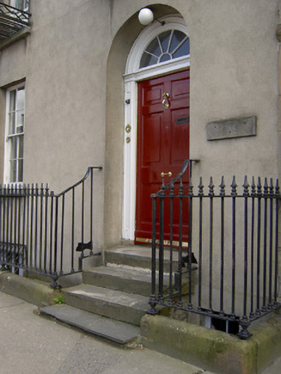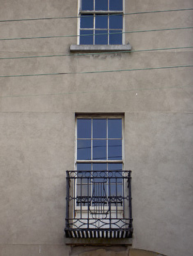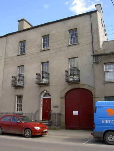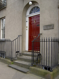 Terraced three-bay three-storey house with attic and half-basement, built c.1835, with integral carriage arch. Pitched roof with rendered chimneystacks. Rendered walls. Square-headed window openings having limestone sills and six-over-six pane timber sliding sash windows, having cast-iron balconettes to first floor. Four-and-four pane timber casement windows to basement. Round-headed entrance opening with timber panelled door, decorative timber panelled pilasters, moulded timber head with spoked fanlight, and limestone steps. Segmental-arch carriage opening with dressed sandstone voussoirs, imposts, surround and plinth blocks and timber battened double-leaf door. Cast-iron boundary railings set on plinths to basement area.