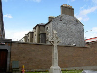 End-of-terrace three-bay three-storey house with half-basement and attic, built c.1840, with full-height hipped roof return to rear. Pitched slate roof with rendered chimneystacks and cast-iron rainwater goods. Lined-and-ruled rendered walls with slate-hanging to south gable and part of rear elevation. Square-headed openings to front and rear and round-headed to rear return, having limestone sills and replacement uPVC windows. Timber casement attic windows to south gable. Elliptical-headed opening with moulded render surround, timber panelled door, ornate petal fanlight, render doorcase comprising render panelled pilasters and moulded cornice, with limestone steps. Cast-iron railings to basement area.