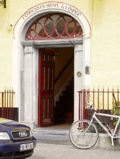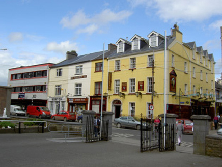 Corner-sited end-of-terrace three-bay three-storey house, built c.1835. Now in use as hotel and pub. Three-bay three-storey addition later increased by bay and attic storey and having recent timber pub-front. Pitched artificial slate roof with rendered chimneystacks, cast-iron rainwater goods and having later dormer windows to front elevation. Gablets to top floor windows of return. Painted rendered walls with render plat-bands at sill levels. Square-headed window openings with painted stone sills, raied render reveals and six-over-six pane timber sliding sash windows. Elliptical-headed opening with moulded limestone surround, dressed limestone doorcase comprising pilasters and moulded cornice, having timber panelled door, decorative fanlight and limestone step. Cast-iron boundary railings on carved and tooled limestone plinths to street. Retaining interior features.