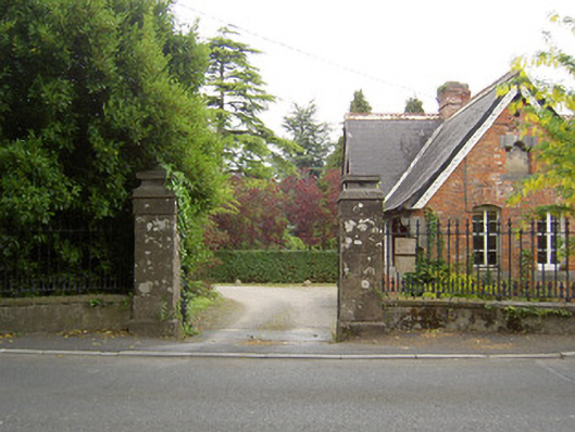 Detached L-plan three-bay single-storey gate lodge, built c.1910. Now in use as house, with verandah to recessed entrance part. Pitched slate roof with terracotta ridge crestings, decoratively carved timber bargeboards to gables with carved timber brackets to apexes, red brick chimneystacks and cast-iron rainwater goods. Red brick walls with limestone string course to projecting front bay, moulded brackets, render plinth and plaque and chanfered timber posts on limestone coping to plinth wall of verandah. Heavy limestone corbel to southwest corner of verandah. Segmental-arch openings with brick voussoirs, flush limestone sills, six pane timber casement windows, some doubled. Segmental-arch door opening with brick voussoirs and replacement timber door, with tiled floor to verandah. Dressed limestone boundary walls and piers with cast-iron gates and railings.
