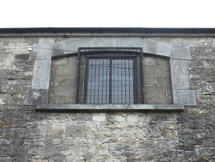 Detached three-bay single-storey goods shed, built 1853, with single-storey lean-to addition to east gable. Pitched slate roof, over-sailing and supported on timber brackets to north elevation. Limestone coping, rendered chimneystack and replacement uPVC rainwater goods. Random rubble limestone walls, dressed to south gable, with tooled limestone quoins, and with dressed limestone block-and-start surrounds to openings in front, rear and upper gable walls, and with limestone sills to windows. Segmental-headed window openings, partly blocked, to track-side and gable elevations with fixed timber windows. Segmental-headed carriage arch to north elevation, with double leaf timber battened doors, with limestone steps. Square-headed entrance openings to east and west elevations with brick jambs and metal roller doors, and pedestrian door with dressed surround to south. Situated at northwest of railway station. Crane with timber shaft and cast-iron machine parts, built c.1885, to east of goods shed.