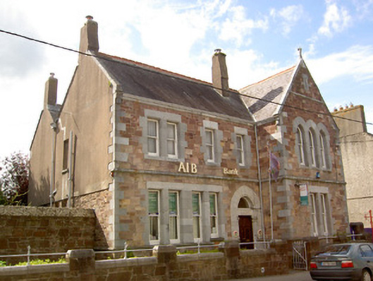 Detached two-storey bank, built c. 1875, comprising multiple-bay two-pile block with single-bay gable-fronted east-west block to north projecting slightly forward. Pitched slate roofs with carved copings, rendered chimneystacks, terracotta ridge tiles, and cast-iron rainwater goods. Cut limestone eaves course, with carved stone finial to gable front. Snecked sandstone walls with dressed limestone quoins and cut limestone string courses. Square-headed openings, some paired and with double pair to banking hall and triple pointed arch windows to upper gable front, all having one-over-one pane timber sash windows with dressed limestone block-and-start surrounds. Continuous limestone sill course to ground floor. Pointed arch door opening with carved limestone surround with voussoirs, engaged limestone colonnettes supporting roll moulding to archivolt above, and timber panelled door with overlight, accessed by limestone steps. Snecked sandstone boundary walls having cut limestone capping and decorative cast-iron gates and railings. Entrance to yard has snecked sandstone piers with cut limestone capping and timber battened doorway and gates. Two-storey outbuilding to rear with pitched slate roof and sandstone rubble walls having carriage arch with limestone voussoirs.