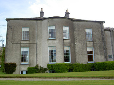 Detached three-bay two-storey over basement country house, built c. 1810, with recessed lower irregular-plan four-bay two-storey 1930s extension to south, full-height bowed bay to rear and flat-roofed porch to front. Used as rectory 1920-1976. Hipped slate roof with lead flashing, cut limestone chimneystacks and eaves course and with cast-iron rainwater goods to main block and pitched and hipped slate roofs to later block. Roughcast rendered walls with dressed limestone quoins and plinth. Six-over-six pane timber sliding sash windows to first floor, nine-over-six pane to ground, all with limestone sills. Rendered and timber porch with Doric-style portico and fixed windows with decorative consoles. Timber panelled double-doors having limestone steps and cast-iron bootscrape. Segmental-arched doorway with spoked fanlight and panelled shutters to interior. Folly and remains of walled garden to site. Dressed limestone piers with plinths, imposts and caps to vehicular and flanking pedestrian gateways with wrought-iron gates and limestone wheelguards. Rubble limestone boundary walls.