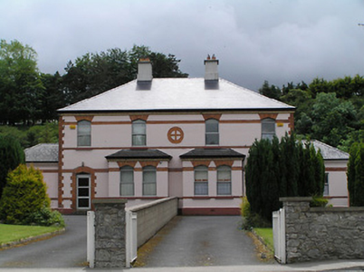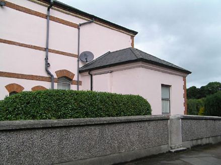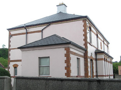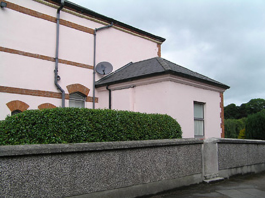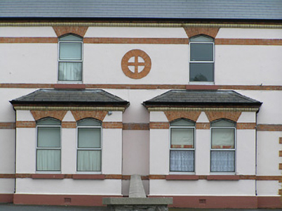 Pair of semi-detached two-bay two-storey presbyteries, built c.1900, with box-bay windows to front with hipped roofs, and slightly recessed single-bay single-storey additions to end elevations, with hipped roofs and moulded eaves courses. Hipped artificial slate roofs, rendered chimneystacks, and moulded red and yellow brick eaves course. Painted rendered walls with red brick quoins, plat-bands at impost and sill levels, cross in circle motif to centre of combined elevation, and rendered plinth. Pseudo-four-centred openings to front and end elevations, paired to end elevations, with red brick voussoirs, having replacement aluminium windows, paired to bay windows, with rendered sills. Square-headed windows to rear elevation, with painted sills. Replacement aluminium doors with red brick surrounds. Rubble limestone piers and walls to site boundary, concrete block wall dividing front gardens, all with flat concrete capping and recent metal gates.