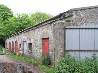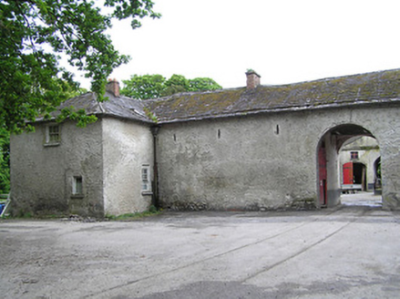 Square-plan stableyard to south-east of country house, builr c.1845, comprising two-storey ranges around closed yard, with seven-bay entrance ranges to north-west and south-east sides, having advanced end bays to north-west, round-headed integral entrance carriage arches set in pedimented three-bay shallow breakfronts and flanked by windows or segmental-headed carriage arches, with six-bay lateral ranges. Hipped slate and corrugated galvanised roofs with limestone eaves course and brick chimneystacks. Roughcast rendered rubble limestone walls. Square-headed window openings with louvred fittings to first floor and small-pane timber casement to ground, with limestone sills. Square-headed door openings with timber panelled double and some half-glazed doors, with cut limestone block-and-start surrounds with raised keystones, and timber battened double doors to carriage arches. Second stable yard to south-east, twentieth-century garage and multiple-bay single- and two-storey outbuildings further south and east. Garage has barrel-roofed corrugated-iron roof, concrete panelled walls, and square-headed openings with timber fittings. Multiple-bay single- and two-storey outbuildings with pitched slate and corrugated-iron roofs, rubble limestone walls and timber fittings.
