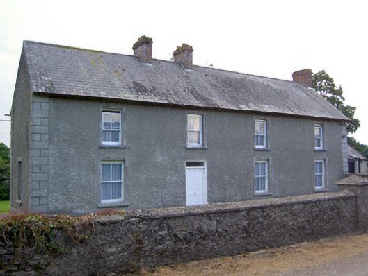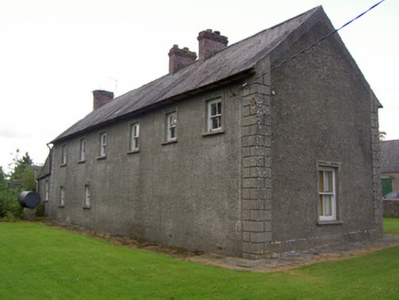 Detached four-bay two-storey house, built c. 1880, possibly incorporating fabric of earlier house, with single-storey extension having hipped slate roof to north, and having six-bay rear elevation. Pitched slate roof with ridge tiles, brick chimneystacks and cast-iron rainwater goods. Roughcast rendered walls with smooth render plinth and quoins. Square-headed window openings with render surround and rendered sills, having timber sliding sash two-over-two pane windows with one six-over-three panes windows to rear elevation. Square-headed door opening with timber panelled door and overlight. Outbuildings to site, having pitched slate roofs and of rubble limestone construction. Pump to site. Random rubble limestone boundary walls with intermittent piers surmounted by render globes, having niches containing religious icons and with wrought-iron gate. Ashlar limestone walls to entrance, with string course and bracketing supporting cut limestone coping, having cut limestone gate piers.