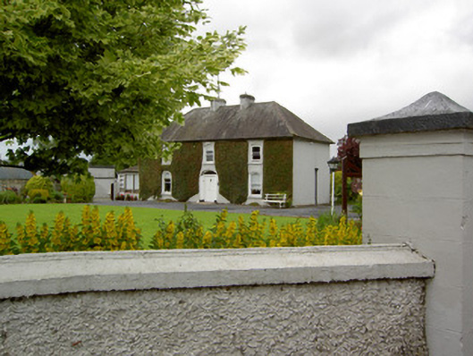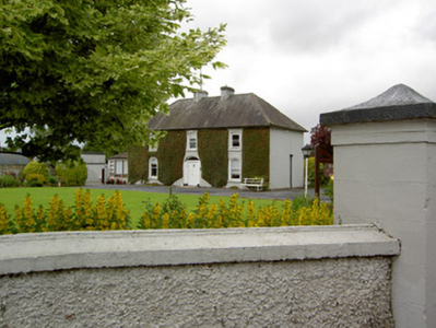 Detached three-bay two-storey house, built c. 1860, with single-storey hipped and pitched artificial slate roof extensions to south-west and rear. Hipped slate roof with ridge tiles, rendered chimneystacks and cast-iron rainwater goods. Roughcast rendered walls. Segmental-headed diminishing window openings with timber sliding sash one-over-one pane windows. Segmental-headed door opening with plain fanlight, double-leaf timber panelled door and render side panels. Lofted single-storey outbuilding with pitched slate roof and random rubble limestone walls to south-west of site. Pump to west of site. Rendered boundary walls and piers with tent-shaped caps.