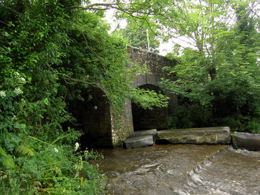 Triple-arch road bridge over Multeen River, built c. 1820, of random rubble limestone construction, having tooled cut limestone voussoirs and jambs to three-centred arches and dressed limestone coping to parapet walls. Cut limestone V-shaped cutwaters to upstream elevation.