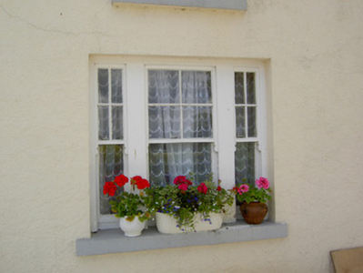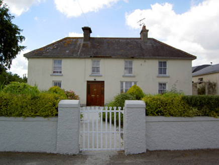 Detached four-bay two-storey vernacular house, built c. 1840, with single-storey extension to rear having pitched slate roof and rendered chimneystack. Hipped slate roof with clay ridge tiles, overhanging eaves, rendered chimneystack and cast-iron rainwater goods. Roughcast rendered walls with smooth rendered plinth. Square-headed window openings with timber sliding sash two-over-two pane windows and painted stone sills, irregularly-placed to rear elevation. Tripartite window opening to ground floor front and south elevations, with timber sliding sash four-over-one pane windows flanked by more slender versions of same, and double timber casement to first floor of latter. Square-headed door opening with replacement double-leaf timber panelled door, overlight and sidelights. Wrought-iron pedestrian gate to entrance.