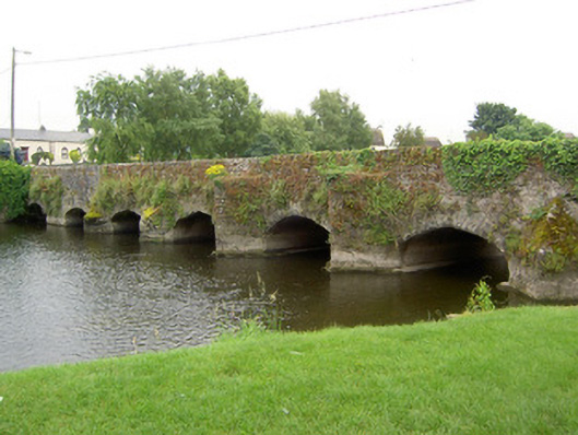 This bridge spans many periods and is interesting as a record of bridge construction from the fifteenth to the nineteenth centuries. The earlier north elevation is identical in span, rise and overall shape to Adare Bridge, Co. Limerick, which dates to 1410, additionally V-cutwaters on this elevation rise to road level and may originally have served as pedestrian refuges, also indicating an early date. A bank was built in the late eighteenth or early nineteenth century, separating the westernmost arch and channelling a millrace from the weir via a corn mill still extant to the north. The plaque located on the west side of the bridge associates the Baron of Dunboyne, James Butler, and his wife Lady Margaret O'Brien, with the rebuilding of the bridge in 1626, and states that the bridge was originally constructed by Nicholas Cowley.