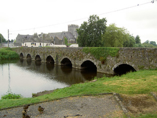 Eight-arch road bridge over River Suir, built c. 1410, with alterations to south elevation 1626, the westernmost arch altered and a bank built to channel a millrace c. 1800. Random rubble limestone with render remaining to some sections of north elevation. Pointed segmental arches with roughly-dressed voussoirs to west end of north elevation, lower segmental arches with dressed voussoirs to east, and having round arches to south with cut limestone voussoirs. Rendered V-shaped cutwaters to west half of north elevation, some to arch level with sloping triangular caps, and others to just below parapet level and perhaps originally containing pedestrian refuges. Plaque dated 1626 with coats-of-arms of James Butler Lord Dunboyne and Lady Margaret O'Brien in moulded panel with inscription beneath set into west end of north parapet of bridge. Weir to north of bridge.