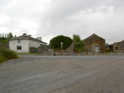 Detached double pile multiple-bay five-storey former corn mill, built c. 1850, possibly incorporating fabric of older distillery, now in use for the generation of electricity. Three-bay two-storey block attached to south and recent single-storey extension to front façade of concrete construction with lean-to corrugated-iron roof. Roof missing from main block, with limestone eaves course. Roughcast rendered limestone walls. Segmental-arched window openings with brick voussoirs. Three parallel warehouse blocks to site with pitched and hipped slate roofs and random rubble limestone and roughcast rendered walls, one now in residential use. Random rubble limestone boundary walls incorporating pointed arch pedestrian entranceway with brick voussoirs and sheet metal door and ashlar limestone piers having double-leaf sheet metal gates. Cast-iron sluice, weir and millrace to site.