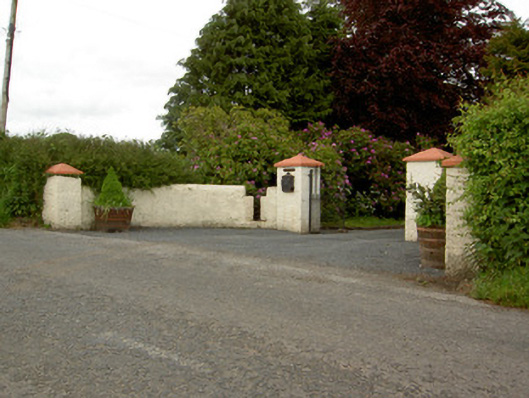 Detached three-bay two-storey house, built 1878, with canted-bay windows to ground floor and lean-to extensions to rear. Hipped slate roof with terracotta ridge cresting and rendered chimneystacks. Painted ruled-and-lined rendered walls with moulded render sill course to front elevation. Square-headed window openings with one-over-one pane timber sliding sash windows, tripartite to canted-bays and having one round-headed window to rear, with painted sills. Round-headed door opening with moulded render hood moulding and having timber panelled door with continuous glazing to sidelights and fanlight. Multiple-bay lofted rubble sandstone outbuilding to rear with pitched artificial slate roof and blocked segmental-arched carriage opening. Painted rendered walls with stile and painted dressed stone piers with cast-iron gates to curving gateway to front of site.
