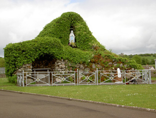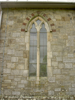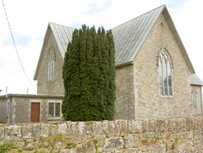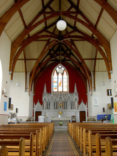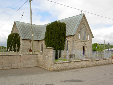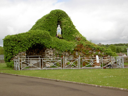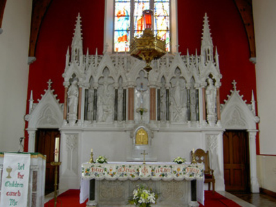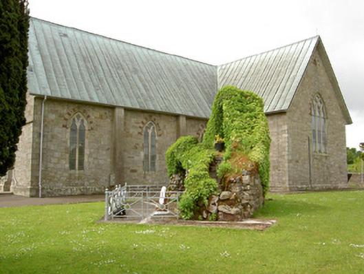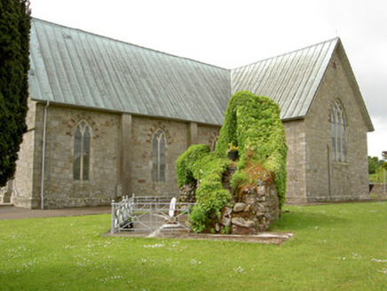Detached south-facing cruciform-plan Roman Catholic church, built 1870, with three-bay nave elevations, one-bay transepts and having flat-roofed sacristy addition c. 1965 to north-west. Pitched copper-sheeted roof, with cast-iron rainwater goods and metal cross finials. Snecked dressed sandstone walls with dressed quoins and plinth, alternately-coloured voussoirs to openings, and buttresses between windows of nave. Gable front has moulded string course and segmental-headed recesses with statues and having gabled canopies. Pointed arch two-light window openings to nave, three-light to transepts and chancel and four-light to entrance front, all with chamfered surrounds, hood-mouldings and stained glass, having Y- tracery to nave and intersecting tracery to transepts, chancel and front elevation. Pointed arch door openings with chamfered surrounds and double-leaf timber battened doors to front and south sides of transepts. Sculpted marble reredos with figure sculpture, coloured marble colonnettes, sprocketed pinnacles and flanked by doorways to sacristy surmounted by crocketed gables with sculpted tympani. Sculpted marble altar in front of reredos. Timber arch braced collared truss roof visible to interior. Panelled timber gallery to entrance end of nave. Freestanding cast-iron belfry to north of site and rubble limestone grotto with cast-iron railings to front to north-east. Wrought-iron gates and railings with snecked sandstone plinth wall and concrete piers to front of site.