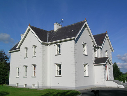 Detached L-plan three-bay two-storey over basement house, built c.1860, facing south, having slightly recessed centre bays to front and rear elevations and slightly advanced centre bay to west elevation. Gable-fronted porch to front elevation and lean-to addition to centre of rear elevation. Gable-fronts to front and rear of end bays and to centre bay of west elevation. Pitched artificial slate roofs, having projecting eaves and terracotta finials to gables, uPVC replacement rainwater goods and rendered chimneystacks. Rendered walls with rendered quoins and painted plinth. Square-headed one-over-one pane timber sliding sash windows with cut limestone sills having render hood-mouldings to front and west elevations to ground and first floors. Margined sash window to first floor of rear elevation. Porch has one-over-one pane timber sliding sash windows to side-walls, with cut limestone sills and reached by flight of cut limestone steps with rendered parapets with cut limestone copings. Round-headed doorway with hood-moulding, timber panelled door and plain fanlight. Yard of outbuildings to north-east, comprising L-plan arrangement of part-ruined two-storey outbuildings with hipped slate roofs and brick chimneystack, rendered rubble limestone walls, square-headed timber louvered windows and square- and segmental-headed entrance openings. Gate-lodge to road is five-bay single-storey with attic, having pitched artificial slate roof and uPVC replacement door and windows. Recent metal double-leaf gates to rendered piers and walls.