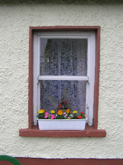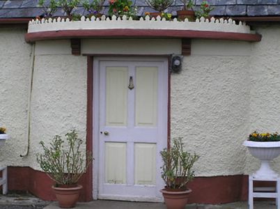 Detached three-bay single-storey with attic house, built c. 1780, with curved windbreak to door and recent single-storey flat-roofed extension to east gable. Pitched slate roof with brick chimneystack. Corbelled rendered canopy with cast-iron cresting over windbreak. Painted wet-dashed walls, smooth rendered plinth. Square-headed window openings with timber sliding sash one-over-one pane windows. Square-headed door opening with timber panelled door. Single-storey outbuildings to either side of front yard have pitched corrugated-iron roofs and painted wet-dashed walls. Rendered walls and piers to site boundary.