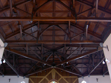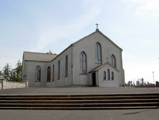 Detached five-bay double-height Catholic church, dated 1828, on a cruciform plan comprising three-bay double-height nave opening into single-bay (single-bay deep) double-height transepts centred on single-bay double-height shallow chancel to crossing (east); single-bay single-storey gabled projecting porch to entrance (west) front. Renovated, 1964. Replacement pitched slate roof on a cruciform plan with perforated crested terracotta ridge tiles, and cast-iron rainwater goods on rendered eaves with cast-iron downpipes. Replacement roughcast walls on cut-limestone chamfered cushion course on rendered plinth with abbreviated rendered diagonal stepped buttresses to corners having "slated" coping. Lancet window openings with concrete sills, timber Y-mullions, and rendered surrounds framing storm glazed over fixed pane fittings. Remodelled lancet window openings to entrance (west) front with concrete sills, timber Y-mullions, and rendered surrounds framing storm glazing over fixed-pane fittings. Interior including vestibule (west); square-headed door opening into nave with glazed timber panelled double doors having sidelights on panelled risers; full-height interior open into roof with mosaic tiled central aisle between cruciform-detailed timber pews, Gothic-style stations between stained glass windows, carpeted stepped dais to sanctuary to crossing (east) reordered, 1964, with pierced quatrefoil-detailed altar below stained glass "Rose Window", and exposed arcaded Queen post timber roof construction on cut-limestone beaded ogee corbels with wind braced diagonal timber boarded vaulted ceiling in carved timber frame on carved timber cornice. Set in relandscaped grounds.