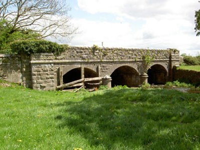 Triple-arch road bridge over the King's River, erected 1866. Rock-faced limestone construction with cut stone string course to snecked rubble parapet walls and cut limestone voussoirs and plinth to segmental arches. Slightly projecting abutments. Carved U-cutwaters to upstream and downstream elevations with pointed capping stones. Plaque to east parapet wall with date of 1866.