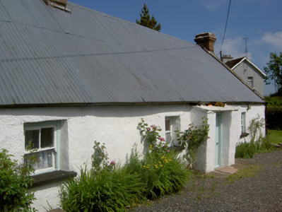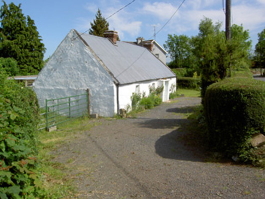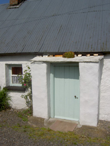 Detached four-bay single-storey vernacular house, built c. 1800, having flat-roofed windbreak and with lean-to sheds to rear and to south-east gable. Pitched corrugated-iron roof with concrete copings, low brick end and centre chimneystacks and replacement uPVC rainwater goods. Painted rendered walls. Square-headed window openings with painted stone sills and timber sliding sash four-over-two, one-over-one and two-over-one pane windows. Diminutive window to rear wall with timber casement window. Square-headed door opening with timber battened door and rendered threshold.