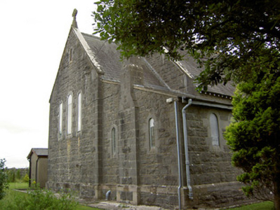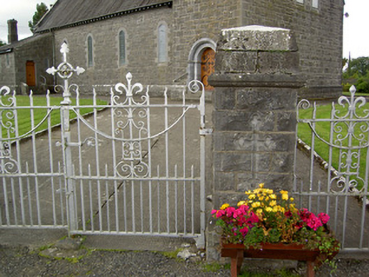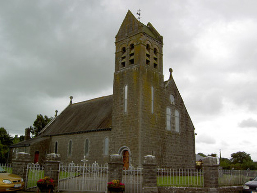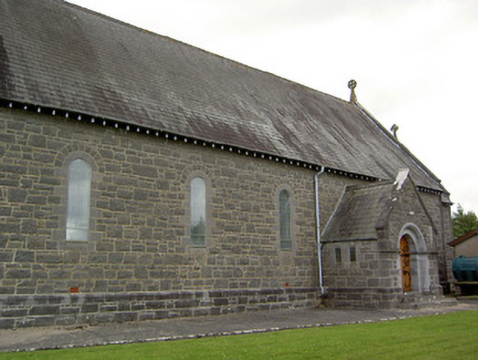 Freestanding Roman Catholic church, built c. 1875, with altar to south, having four-bay nave, one-bay chancel, three-stage bell tower on square plan attached to north-east corner, porch to west elevation and sacristy to south-east. Pitched slate roof with raised gables, having cut limestone cross finials to gable ends, cut limestone chimneystack to sacristy, timber eaves brackets and cast-iron rainwater goods. Pitched slate roof with raised gables, cut stone eaves brackets and cast-iron weather vane to tower and catslide slate roof to sacristy. Snecked dressed limestone walls with rock-faced plinth having cut stone copings. Cut limestone with carved string course to top stage of tower. Round-headed windows throughout except for porch and some to sacristy, all with stained glass and having dressed limestone block-and-start surrounds, with dressed limestone voussoirs above to windows of main block. Cinquefoil opening to upper north gable. Paired windows to top stage of tower with continuous carved limestone hood moulding, with timber louvered fittings. Round order arch doorways to tower and to porch, having chamfered block-and-start surround to outer order, and having moulded limestone impost course and cut limestone steps. Timber battened double doors with ornate cast-iron strap hinges. Shoulder-arched doorway to sacristy with timber battened door, having decorative wrought-iron strap hinges and cut limestone steps. Lawned area to site. Rock-faced limestone piers with croix pommées and decorative cast-iron railings and gates to site.