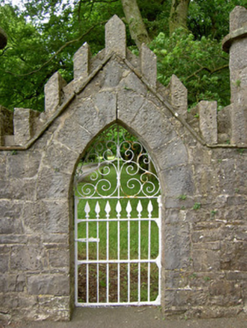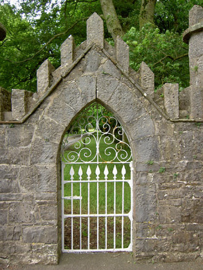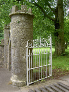 This robust monumental Gothic Revival gate, of substantial limestone construction with delicate wrought-iron detailing, is representative of the imaginative novelty and craftsmanship of the mid-nineteenth century. The gateway forms a grand and imposing entrance announcing the presence of Grantstown Hall beyond.