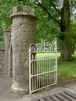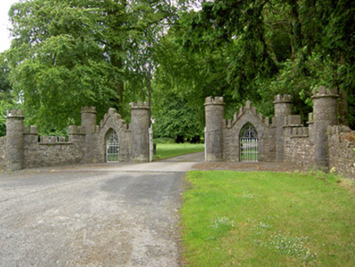 Quadrant gateway to Grantstown Hall, comprising paired Gothic Revival castellated gate piers on circular plan, of ashlar limestone construction, built c. 1870, having decorative double-leaf wrought-iron gates to central vehicular opening. Castellated walls linking paired piers, constructed of roughly coursed limestone and having pointed arch pedestrian entrances with decorative wrought-iron pedestrian gates. Stepped castellated roughly coursed limestone walls continue diagonally from outer piers, terminating in castellated ashlar limestone gate piers on circular plan.