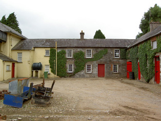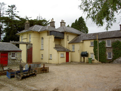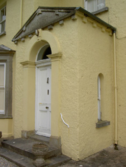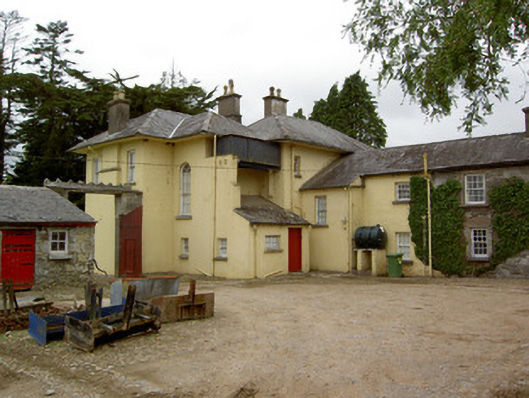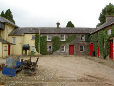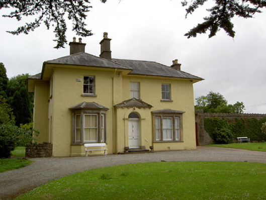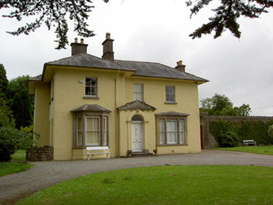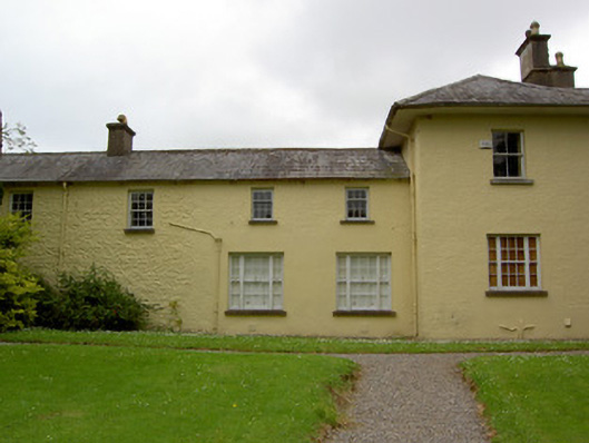 Detached three-bay two-storey house on irregular plan, built c. 1870, comprising two parallel blocks, having shallow return to rear with lean-to addition, pedimented porch to front, canted-bay window to north-west gable of front block and incorporating two bays of lower two-storey outbuilding in yard to rear. Hipped slate roofs with overhanging eaves, rendered chimneystacks with clay pots and having cast-iron rainwater goods. Painted roughcast rendered walls. Square-headed window openings having timber sliding sash two-over-two pane windows, tripartite to ground floor front and cut limestone sills. Tripartite and bay windows set in chamfered sandstone surrounds and have slate rooflets with lead ridge cappings. Six-over-six pane timber sliding sash, some tripartite, to north-west elevation and some three-over-six pane to same elevation. Porch has hipped slate rooflet, round-headed one-over-one pane timber sliding sash window to side wall and round-headed door opening with timber panelled door and plain fanlight, with flanking painted rendered pilasters supporting painted rendered archivolt, surmounted by rendered pediment with dentil detail. Cut limestone steps to porch. Window shutters to interior of house. Square-headed opening of ashlar limestone construction to rear yard, having decorative limestone coping. Outbuildings around yard to rear, that to north-west being six-bay two-storey, part of which is incorporated into house, multiple-bay two-storey range to south-west, nine-bay single-storey building to south-east and multiple-bay single-storey outbuildings to south-east, all buildings having pitched slate roofs and roughly coursed rubble limestone walls with red brick voussoirs to openings. Pump to yard. Decorative cast-iron gate piers, gates and railings to entrance, flanked by rubble limestone quadrant walls.