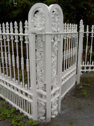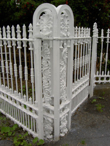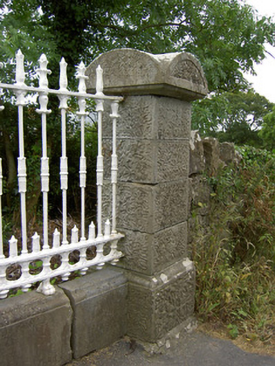 Gateway erected c.1820, consisting of decorative cast-iron gate piers on square plan flanked by cast-iron pedestrian and double-leaf entrance gates and with cast-iron railings on cut limestone plinths curving to outer square-plan tooled ashlar limestone piers with segmental-headed faces to caps. Single-storey gate lodge inside gates.